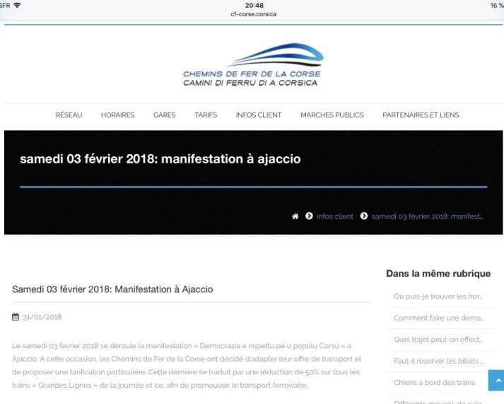 Une société publique locale, les chemins de fer de la corse, financée par la collectivité de corse, donc par nos impôts, offre 50% du prix du billet de train pour se rendre à la manifestation politique nationaliste du 03 février à Ajaccio !